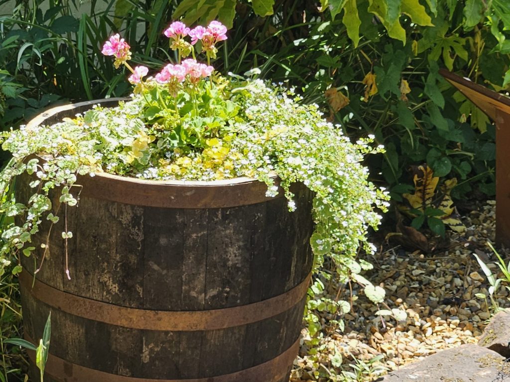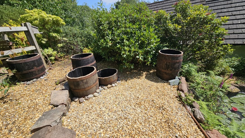 A weed membrane was added to reduce the amount of weeds that would be able to grow in the new gravelled barrel garden.