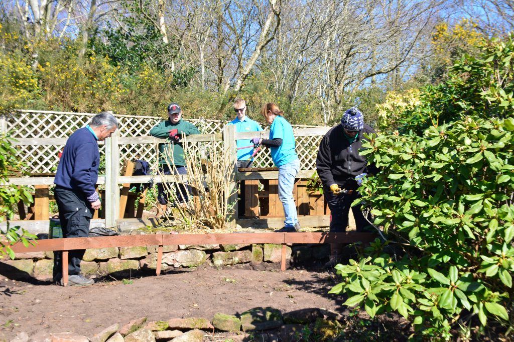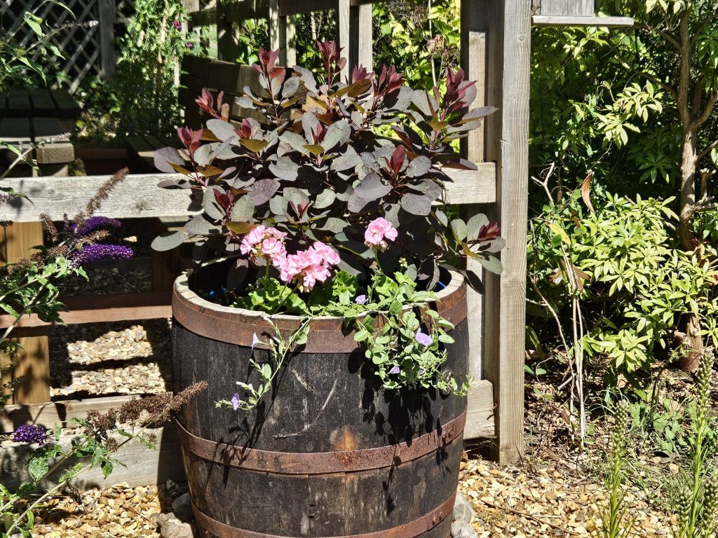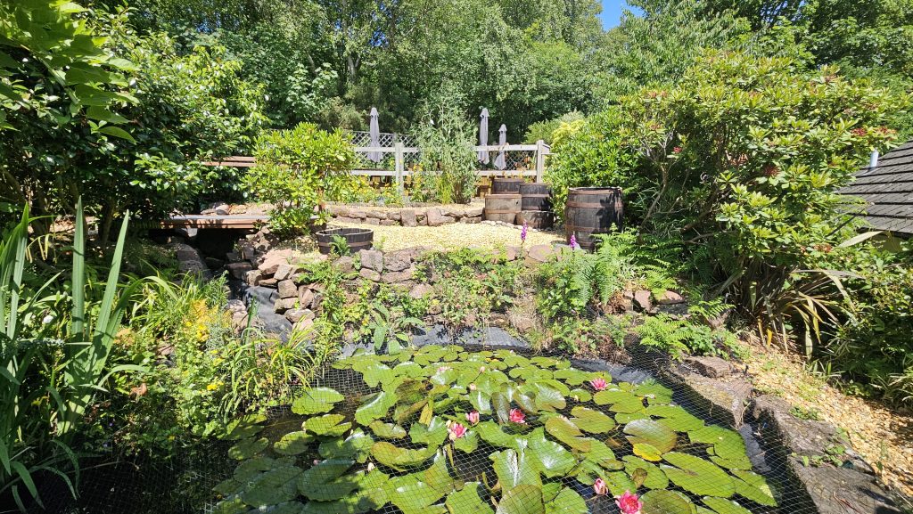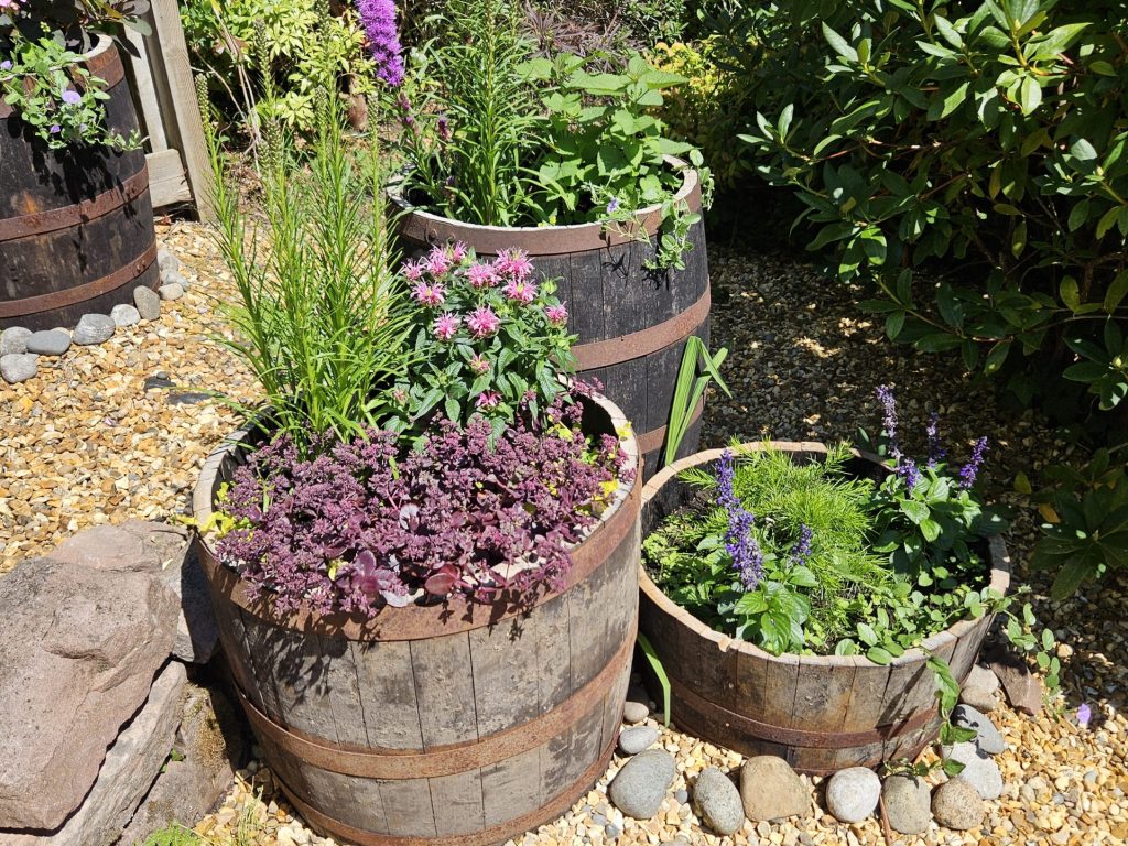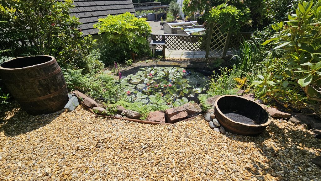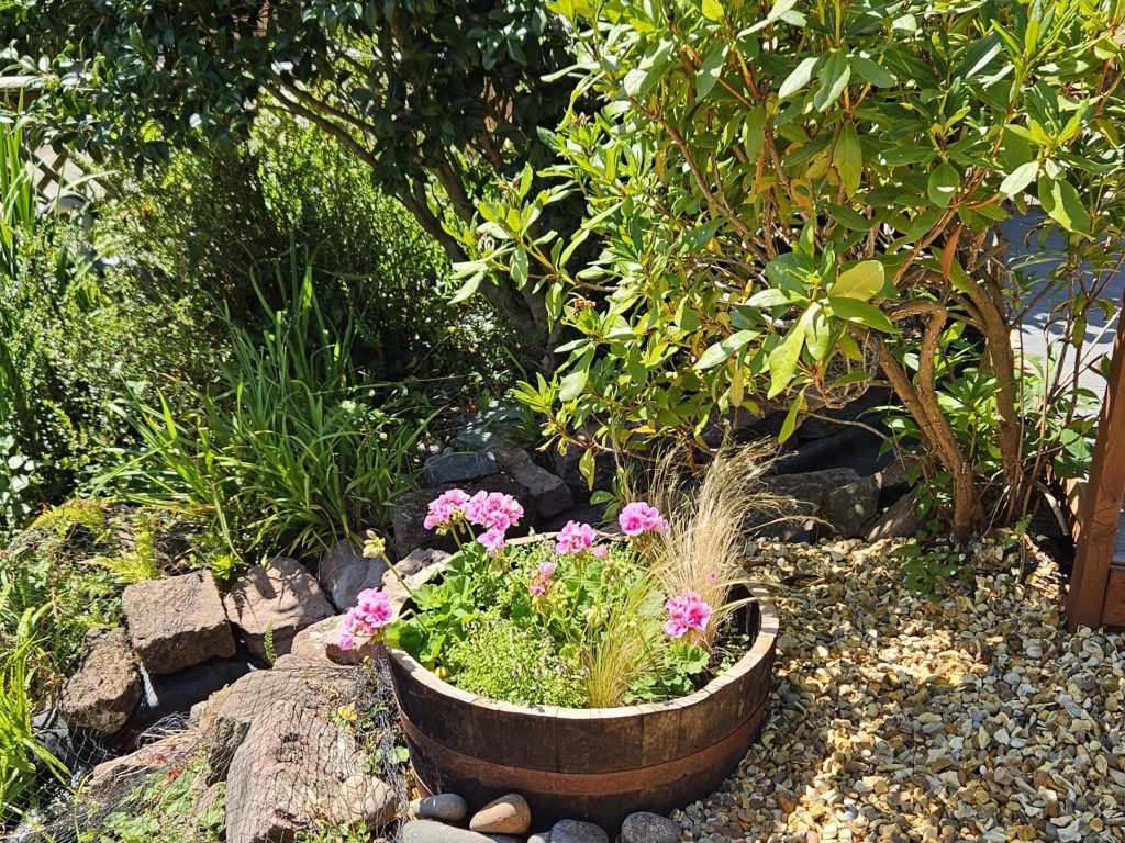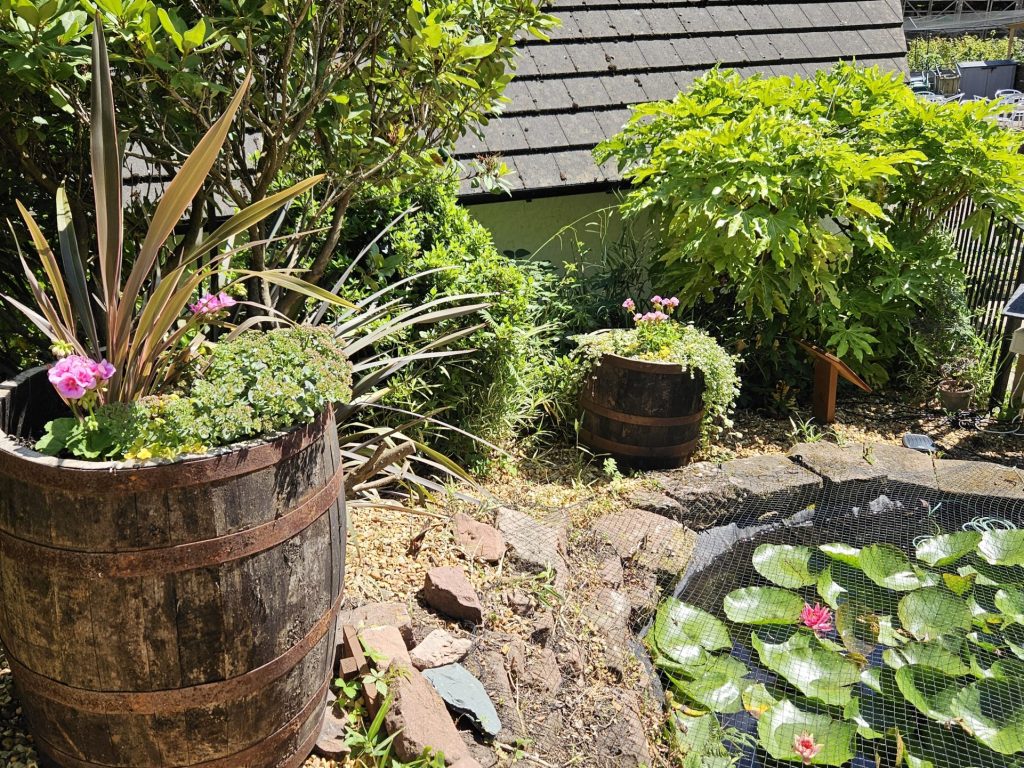 The planting area around the pond has been inaccessible to the people we support and volunteers for some time. As a consequence the area has become overgrown and in need of some tender loving care. It was decided to make the space more usable and to improve access by creating a new low maintenance barrel garden between the two ponds.